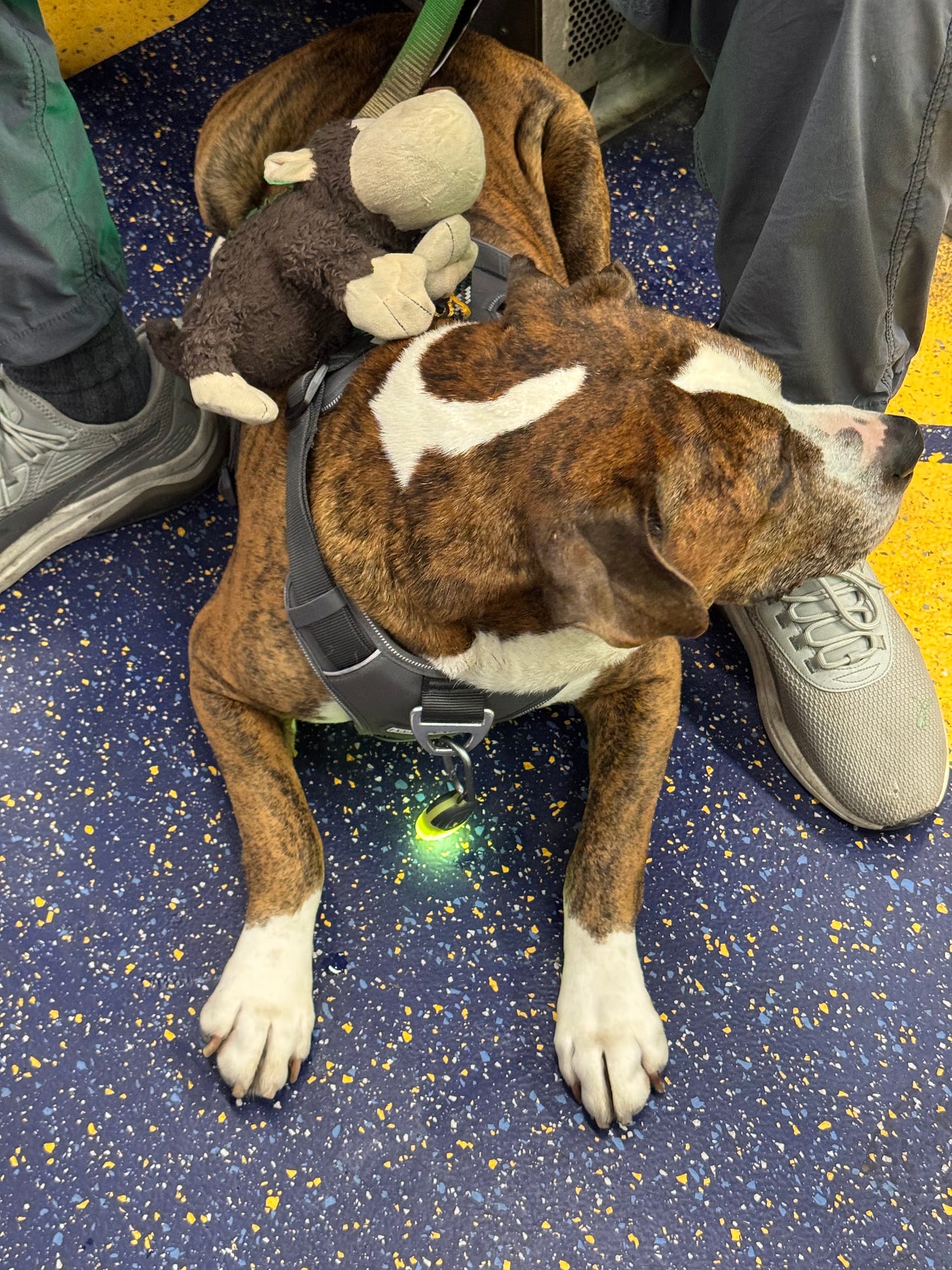 3/8 - We met a big American boxer on the train named Maximus who was so afraid of skateboards that he was trembling. But someone was just holding one, they weren’t even on it. Pig is the same way. His owner loves him so much. I am the same way. They got in a car accident together a few years ago and Maximus still needs help walking on his back legs. His owner pet him and goes “yeah my boy Maximus” then gestured to the animal on his back and said “And this is minimus. He doesn’t go anywhere without him”. Something about this tough grown man, like The Rock, talking about how he and his little buddy Maximus don’t go anywhere without each other. sobbing