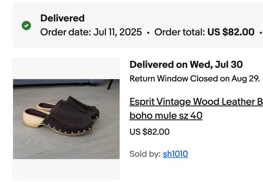 $32 black size 39, $38 size 6 sandal clog, $20 Ugg fur clog size 9 (I have these in purple from high school LOL), $19 suede Gap size 6