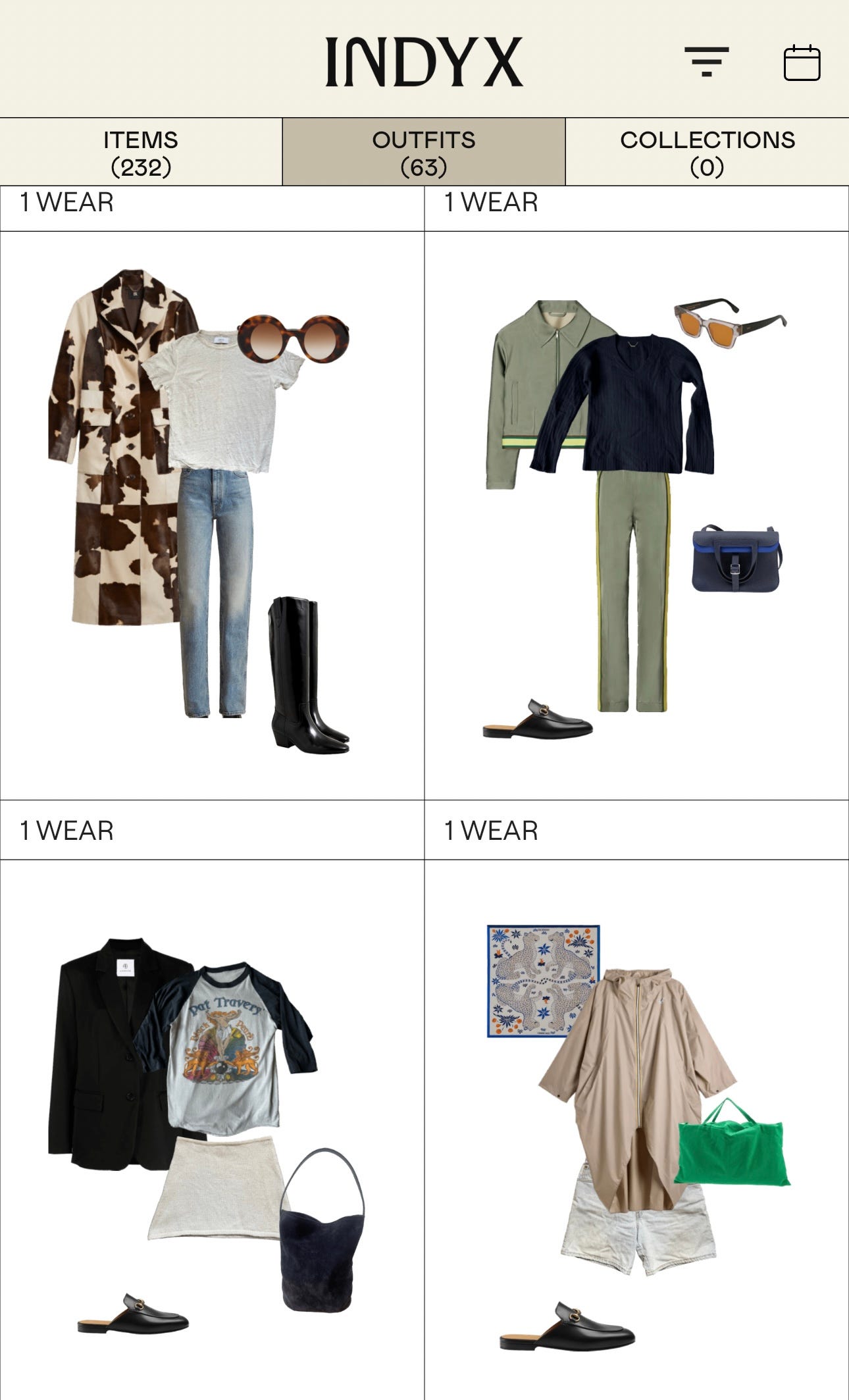 The way Indyx is set up is just one personal styling method, but I’ve come to love it as both a stylist and user. Yes, it’s cumbersome to upload your entire closet (although using website flat-lays before trying to take any of your own photos does make it easier). I don’t digitize or track anything else in my life like books, movies, or workouts, but tracking my closet has helped me become more aware of how much stuff I have and actually inspires me to use that stuff. One minute I’m cruising my wishlist on The Real Real to pick an item to free from Obsessions Jail, only to open Indyx to style it into my current outfits and ask myself if I can go without or just use one of my 232 closet items first…